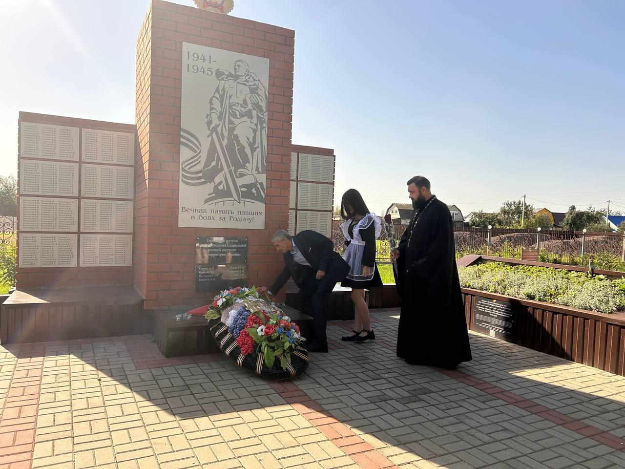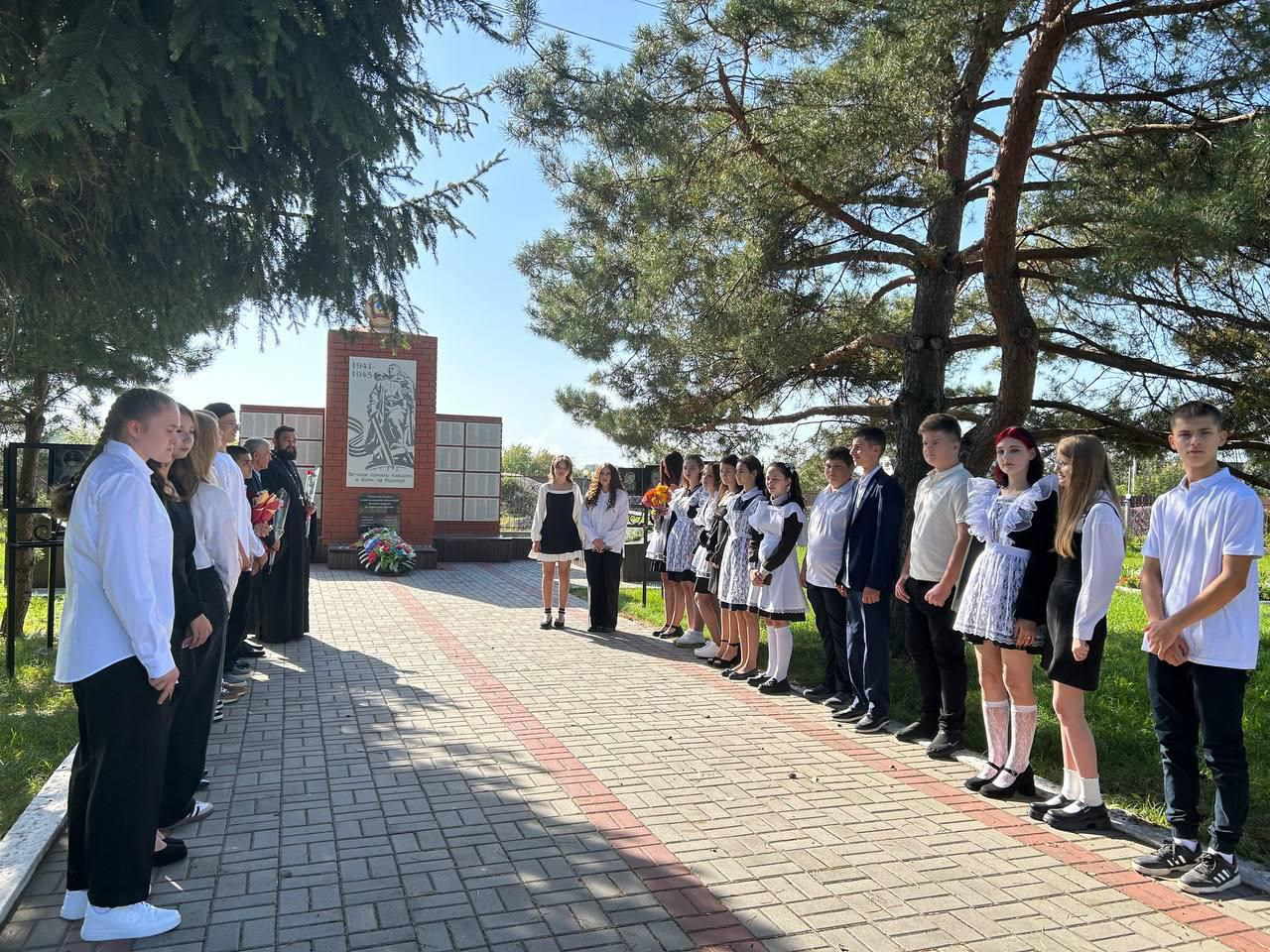 После, вместе с учениками возложили цветы у памятника павшим воинам.