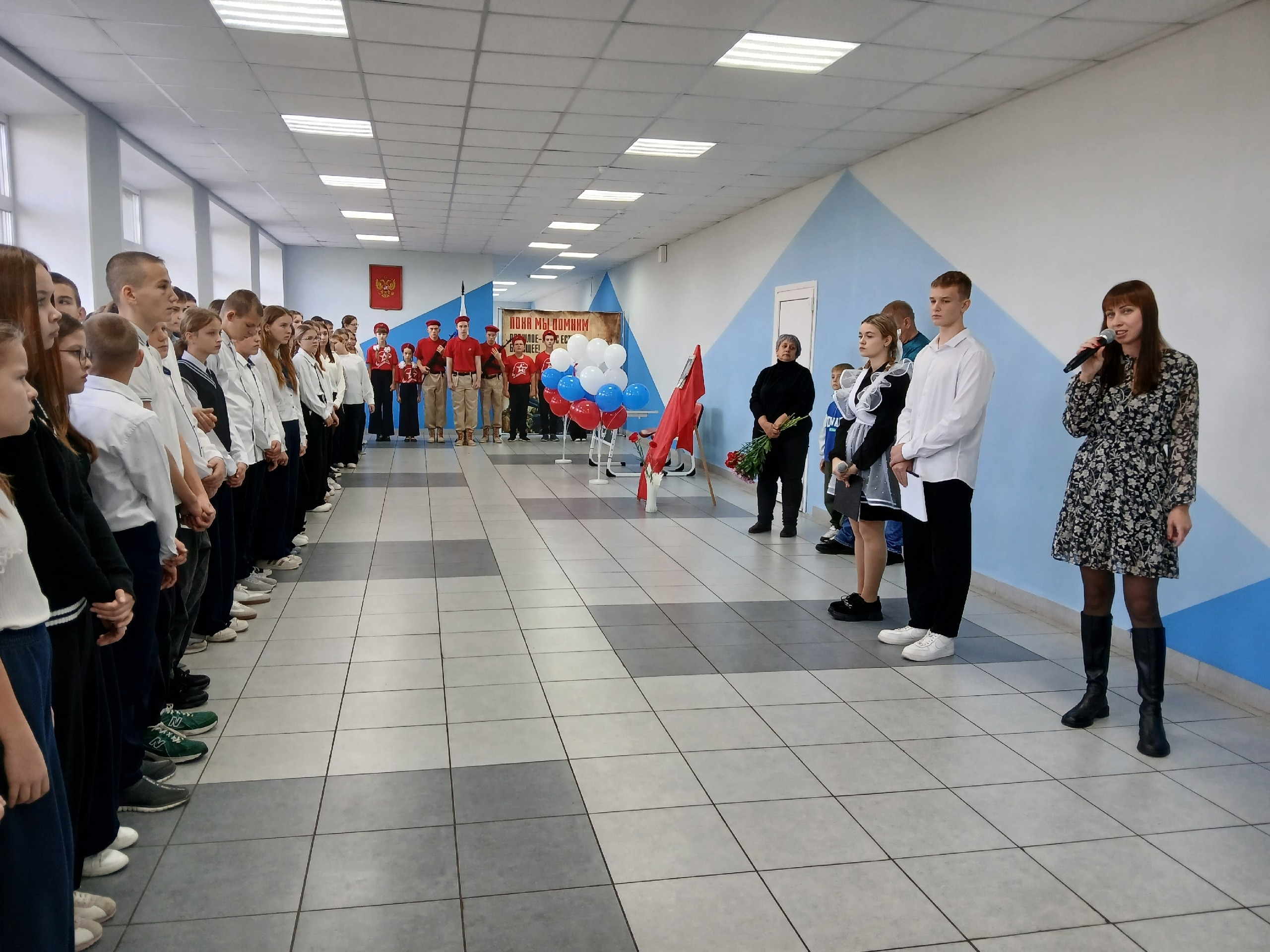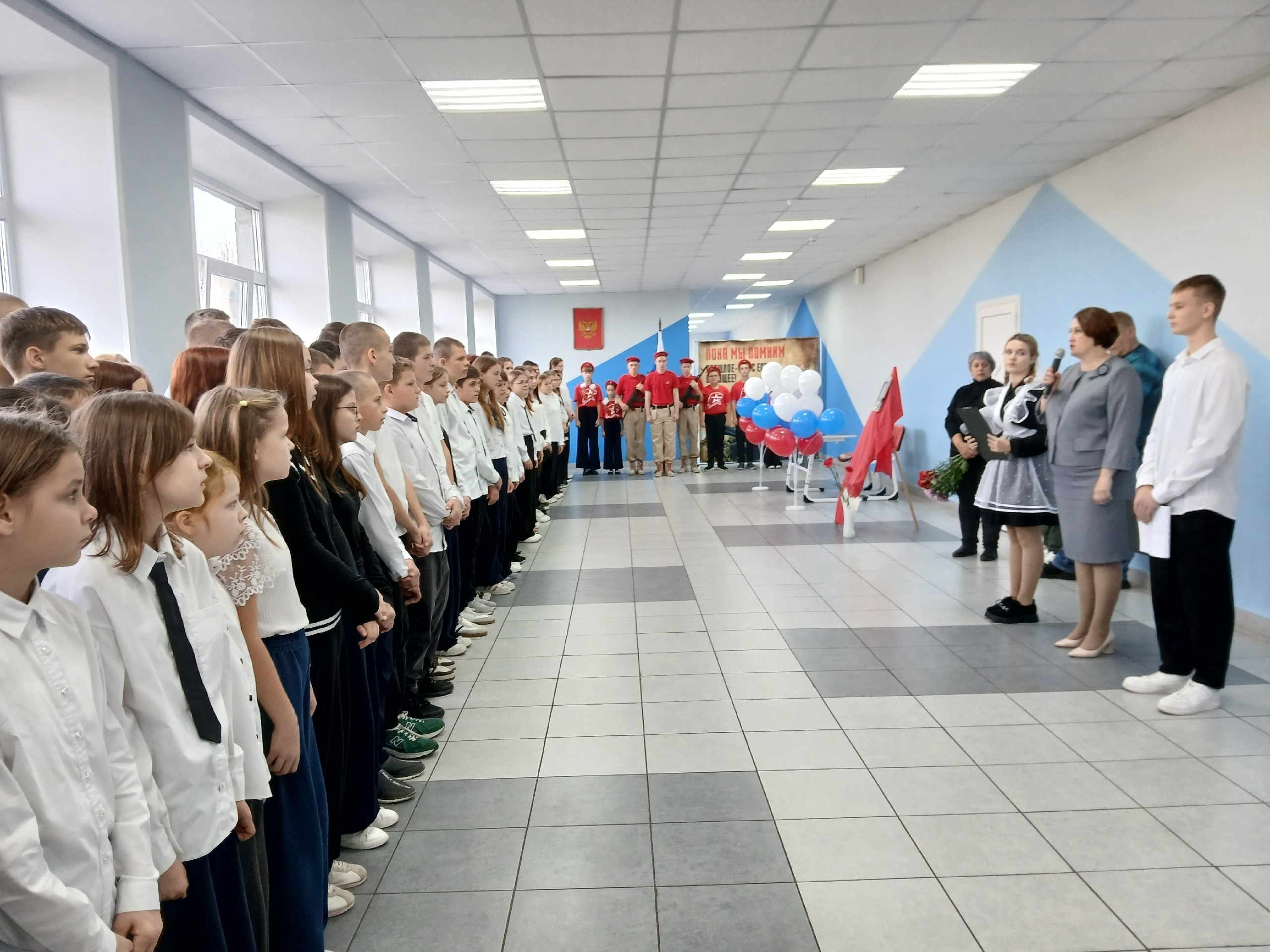 Заместитель директора Костина Елена Александровна объявляет, что право первым сесть за Парту Героя предоставляется активистам Движения Первых, отличницам Асташиной Елизавете и Хопиной Дарье.