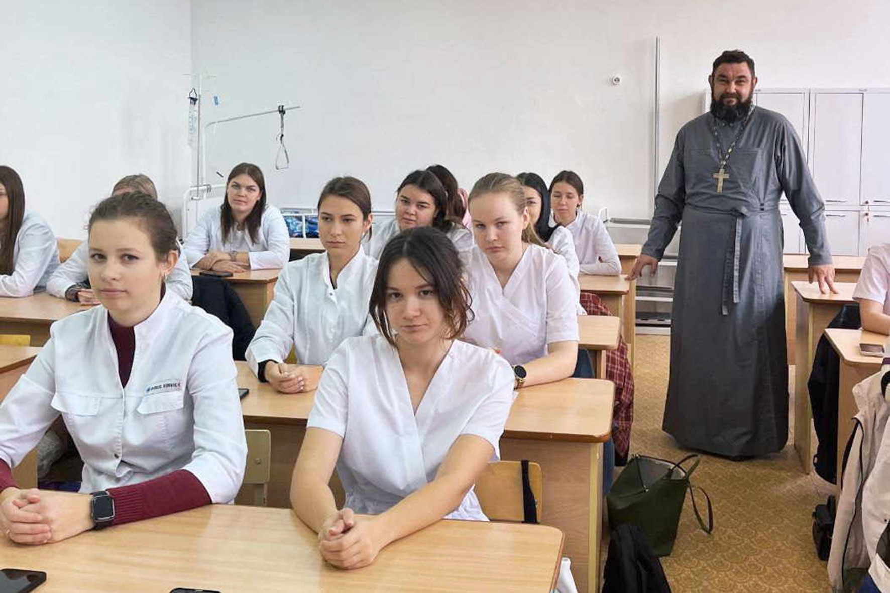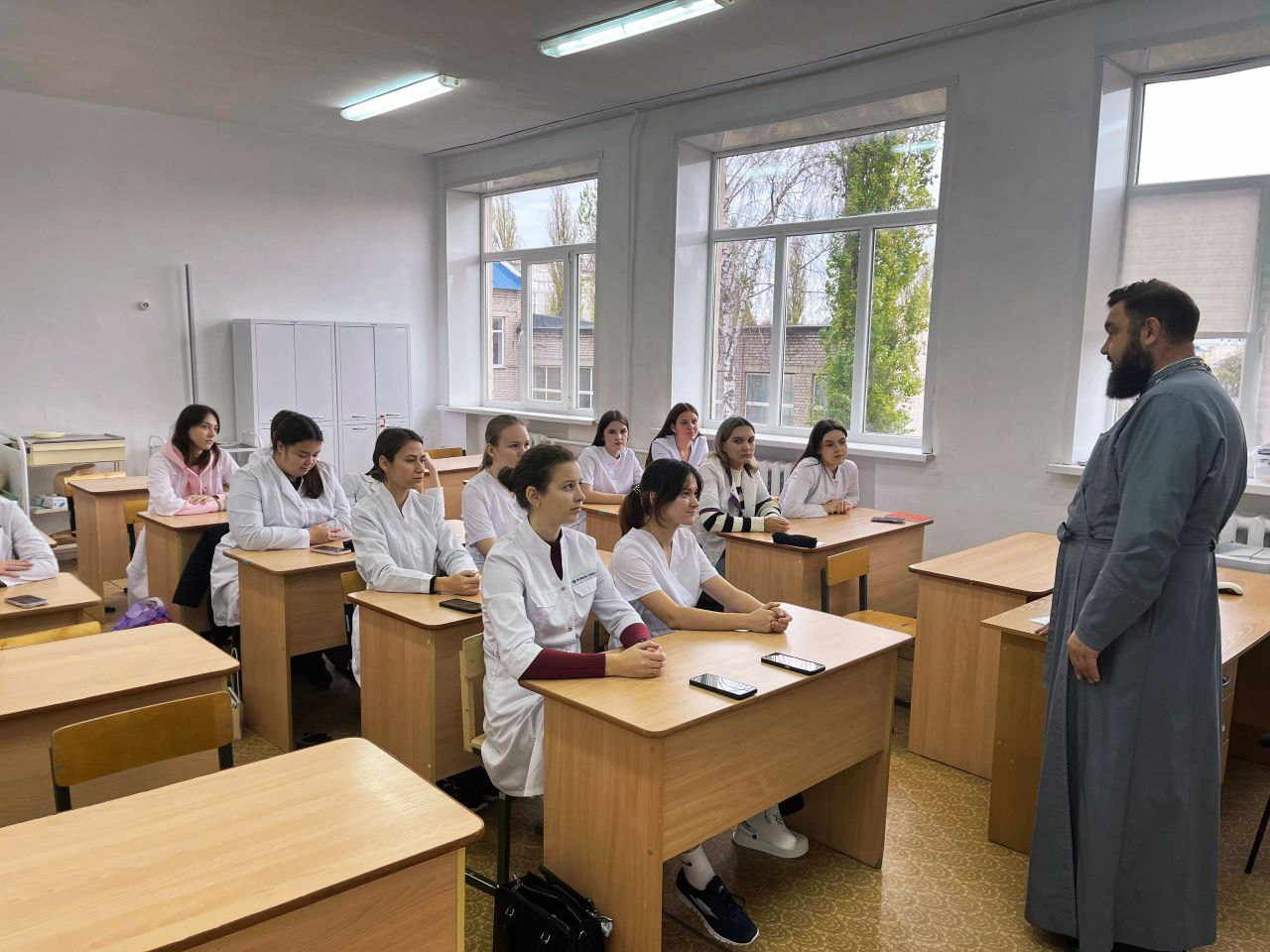 27 октября в Усманском филиале ГАПОУ » Липецкий медицинский колледж » в рамках курса учебной дисциплины «Основы православной культуры» ответственный за социальное служение Усманского ЦО протоиерей Димитрий Малахов, провел беседу со студентами 4 курса специальности Сестринское дело.