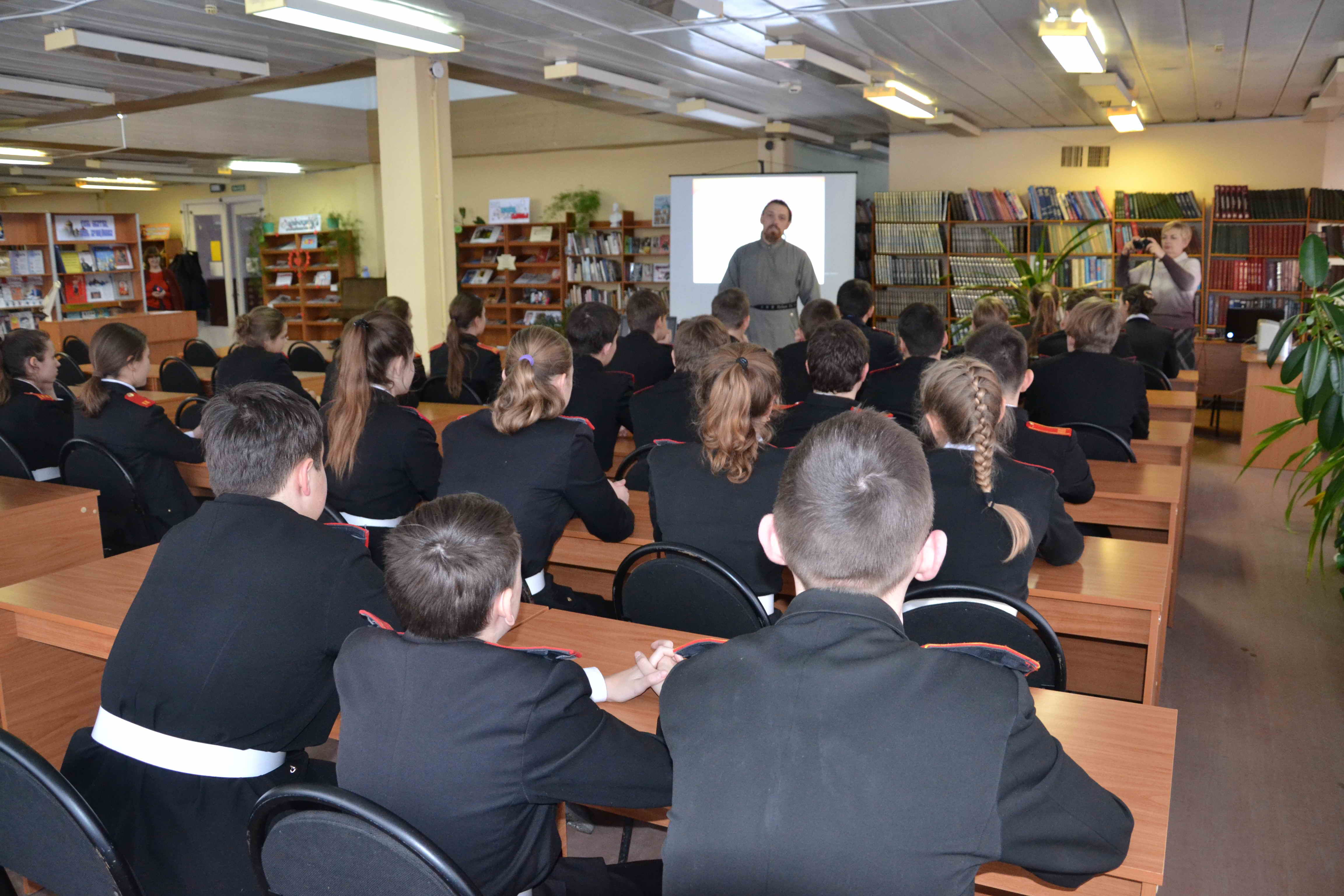 В ходе беседы отец Алексий обсудил с кадетами такие вопросы: «Есть ли у человека душа?», «Что значит быть русским?», «Почему князь Владимир выбрал Православие и отказался от славянских языческих утопий?»
