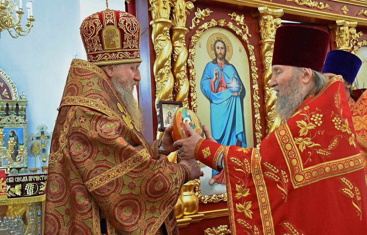 Настоятель храма поблагодарил Владыку за служение и преподнес в дар Пасхальное яйцо.