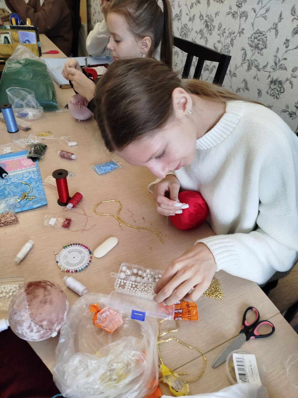 28 декабря состоялось очередное занятие в рамках проекта «Золотая нить», реализуемого при поддержке Министерства внутренней политики Липецкой области, на котором девочки, переносят придуманный ими рисунок на бархат, который будет натягиваться на пластиковый шарик. Используя материалы для орнамента (стеклярус, бисер, жемчуг, разноцветные стразовые цепи) начинают получатся замечательные шарики.